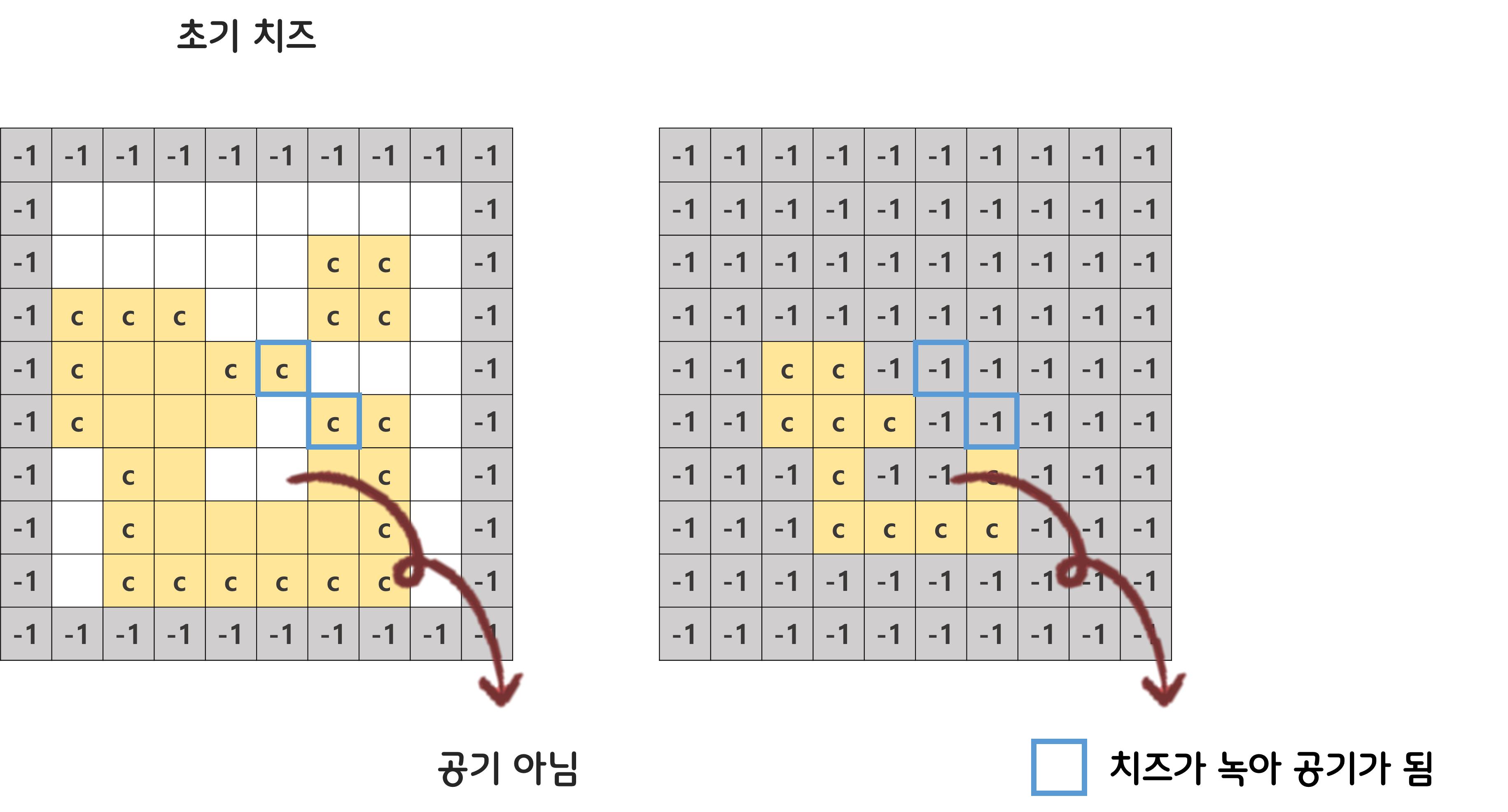 시간이 1씩 증가할 때마다 공기의 상, 하, 좌, 우 방향으로 겉부분의 치즈를 공기에 노출되게끔 한다.