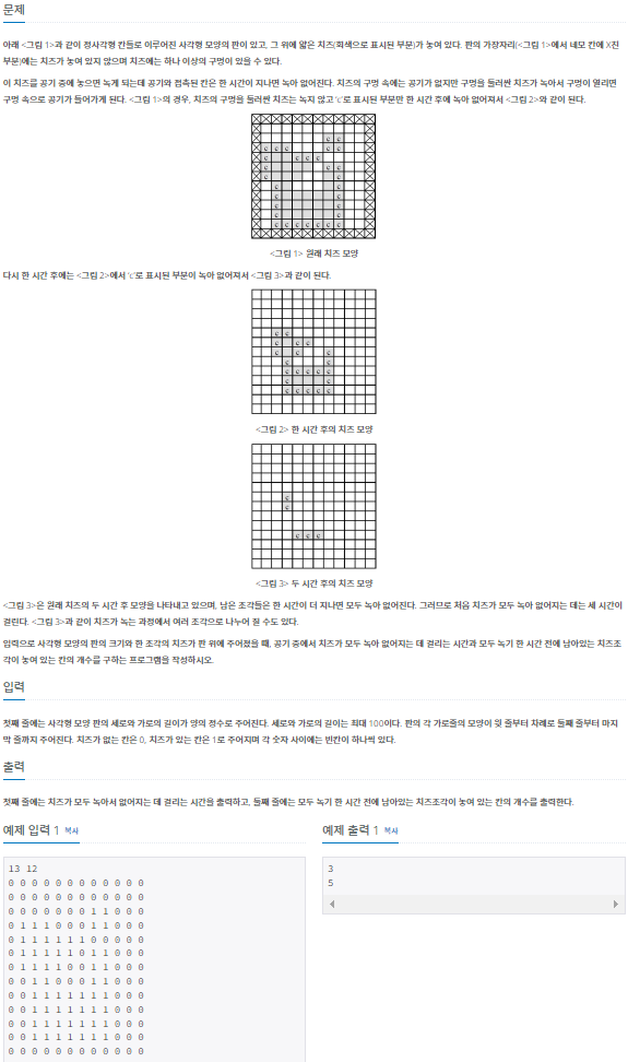 원래 치즈 모양과 예제 입력에서 치즈 내부의 구멍이 있는 '0'인 곳은 공기로 보면 안 된다.